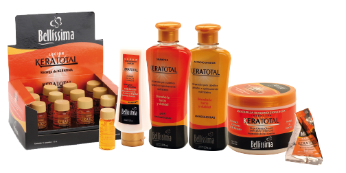 La keratina es la proteína mas importante que compone la estructura capilar. Los cabellos pierden keratina diariamente a través de distintos procesos químicos como: coloración, alisados, permanentes, exposición al sol, etc., dejando los cabellos quebradizos, con puntas destruidas y sin brillo. Keratotal repone la keratina reparando la fibra capilar desde su interior.